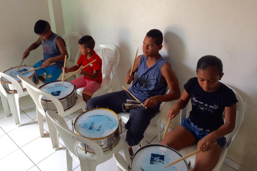 Caixa, surdo, agogô, reco-reco, ganzé... são alguns dos instrumentos de percussão que as 30 crianças aprendem durante as aulas com os instrutores do Curro Velho. Danilo, Carlos, Tiago e Antônio fazem parte da turma.