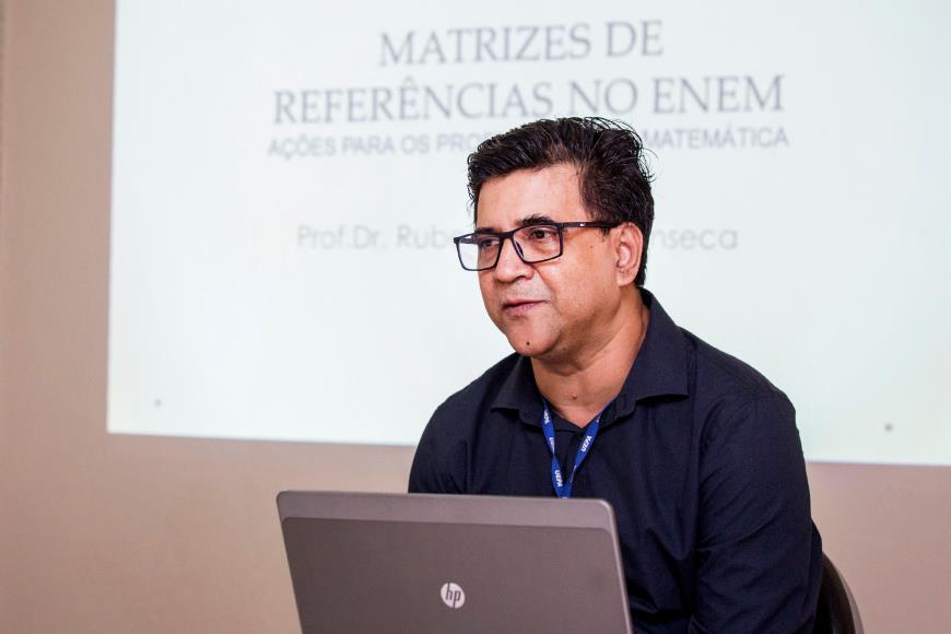 Palestra - O professor Rubens Fonseca, do Departamento de Matemática, Estatística e Informática (DMEI) ministrou a palestra “A matriz de referência do Enem – Ações para os professores de Matemática”. Em sua explanação, o professor atentou para as diversas matrizes existentes para o ensino da Matemática e chamou atenção para os limites impostos pela adoção de apenas uma delas no Ensino Médio.