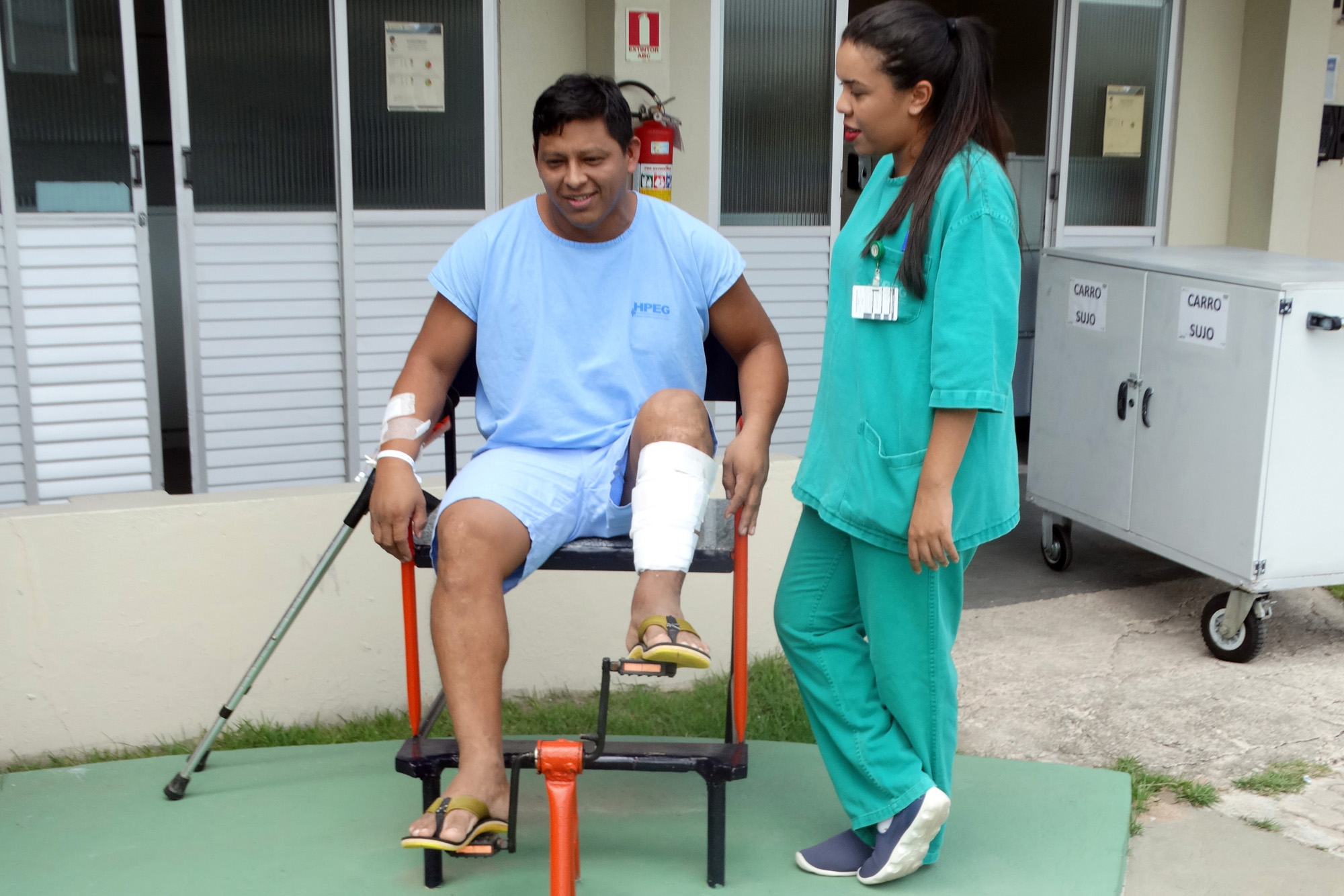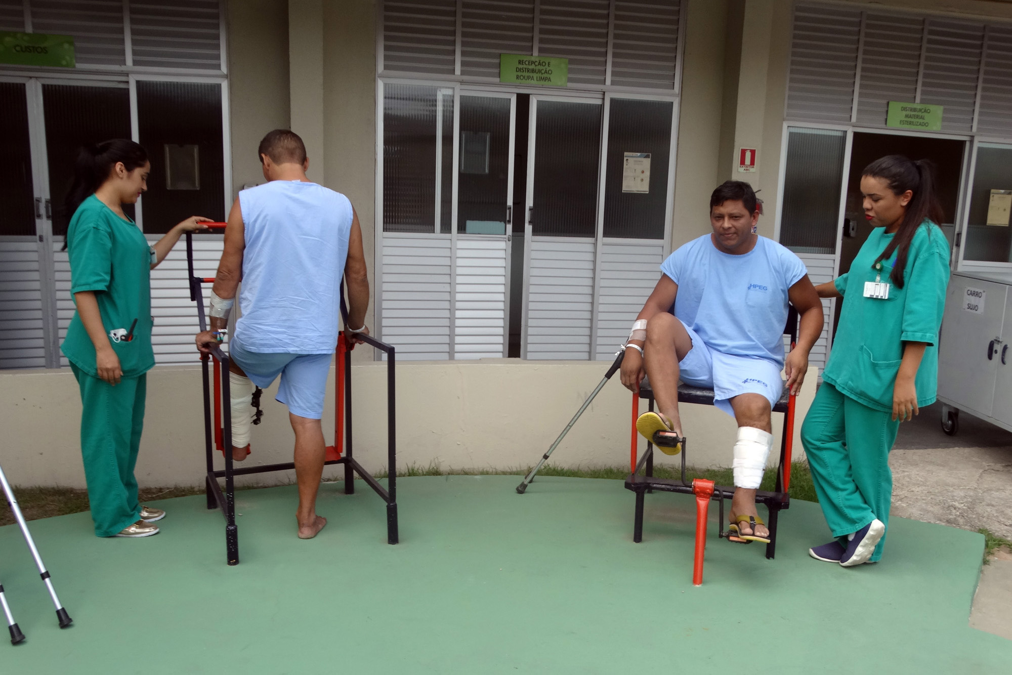 Quase todos os pacientes do Hospital Galileu podem participar da fisioterapia na academia ao ar livre. A exceção é apenas para os que ainda não podem sair do leito. Eles fazem treinamentos de caminhada, marcha, amplitude de movimento, ganho de força muscular, entre outros exercícios.
