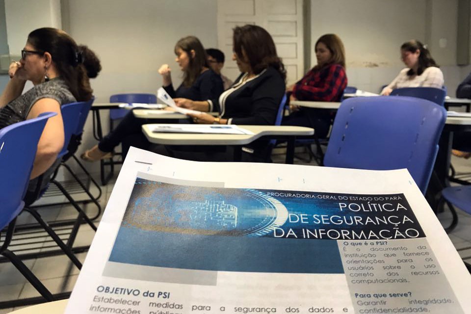 A Procuradoria-Geral do Estado (PGE) realizou nesta quinta-feira, 12, uma reunião para apresentar a projeto referente à Política de Segurança da Informação (PSI) da instituição para os multiplicadores e os mobilizadores do Projeto denominado “Nova PGE - Valorização dos servidores e otimização da utilização dos espaços físicos da PGE/PA”. O evento ocorreu na sede da Escola Fazendária, em Belém.