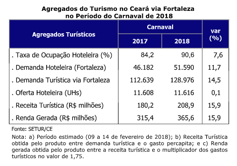 O Ceará deve receber cerca de 130 mil turistas neste Carnaval, número 14,5% superior ao mesmo período do ano passado. Os dados são da Secretaria do Turismo do Ceará (Setur), que prevê um impacto de R$ 208,9 milhões de receita direta e R$ 365,6 milhões de renda indireta, gerada em toda cadeia produtiva do turismo. O valor representa um crescimento de 15,9% em relação ao mesmo período de 2017.