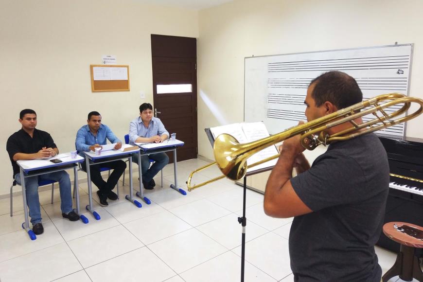 Apesar da tensão e do nervosismo, o estudante Reginaldo Oliveira conseguiu fazer uma boa prova. Ele tenta uma vaga para estudar trombone. “Fiquei nervoso, mas consegui executar a peça que eu ensaiei. A banca examinadora é bem rigorosa para avaliar a interpretação, articulação, afinação e sonorização. Fiz de tudo para controlar meu nervosismo e não errar nenhum trecho da música”, contou o estudante
