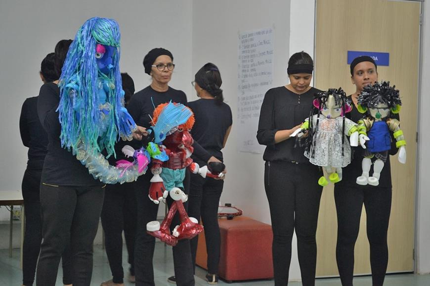 O oficineiro mediou ainda uma vivência de aprendizado de modo aberto, experimental e contributiva sobre a prática de manipulação de bonecos. Para isso, associou duas necessidades: primeiro a de instrumentalizar a equipe da Biblioteca Itinerante da FCP para a leitura de conceitos da linguagem e, segundo, para ampliar as ferramentas de trabalho na área para suas práticas como agentes multiplicadores dentro de um processo criativo, que permite uma melhor organização e valorização das ideias.