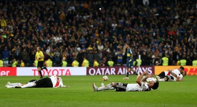 Atletas do River desabam de cansaço e emoção após final contra o Boca, em MadriREUTERS/Sergio PerezO River Plate venceu o Boca Juniors por 3 a 1, de virada, na prorrogação — após empate em 1 a 1 no tempo regulamentar — e conquistou o título da Copa Libertadores de 2018. Foi o quarto título do clube na história da principal competição de futebol na América do Sul. Lucas Pratto, Quintero e Pity Martínez fizeram os gols do River. Benedetto havia aberto o placar para o Boca. |