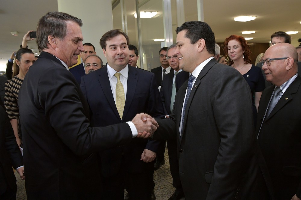 Presidente Jair Bolsonaro cumprimenta o presidente do Senado, Davi Alcolumbe; ao centro, o presidente da Câmara, Rodrigo Maia — Foto: Marcos Brandão/Senado